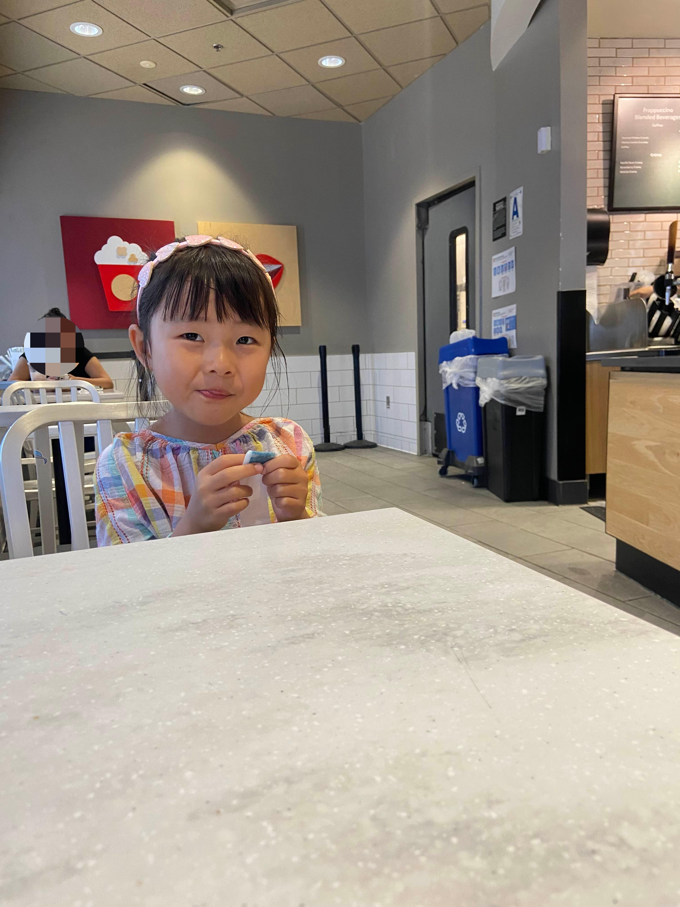 목적지에 다 도착했을 무렵 급하게 처리해야 하는 일이 있어서 타겟에 있는 스타벅스에 들어가 업무를 보았다. 음료 기다리는 동안 챙겨 온 간식거리를 야무지게 꺼내서 먹으며 기다리는 착한 내 딸. 원래 달달한 간식이나 젤리류는 잘 안 주는데 이 날은 여섯 살 아이가 버티기엔 여러 번의 기다림이 있었기에 달달구리를 먹으며 행복해했다